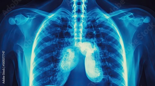 Human chest X-ray with a focus on internal organs, highlighting diagnostic areas for treatment, demonstrating the capabilities of modern medical imaging