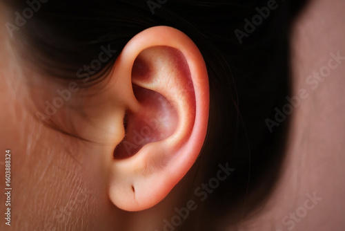 Human ear detail with soft lighting and dark background auditory hearing