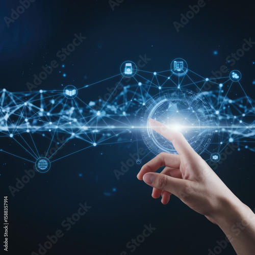 human, hand, finger, touching, glowing, digital, network, technology, futuristic, connection, datum, information, abstract, blue, light, interface, virtual, cyber, science, innovation, communication, global, system, touch, interaction