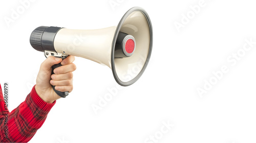 Human hand holding a megaphone, announcement and communication concept. transparent Background, clipping path -