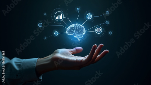 brain, digital, technology, hand, human, network, global, connection, datum, analysis, information, futuristic, innovation, intelligence, artificial, ai, science, learning, cognition, mind, concept, glowing, hologram, interface, communication, cyber, biotechnology, neurology, strategy, insight, future, business, success, growth, progress