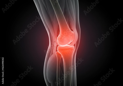 Human knee joint anatomy with red inflammation and pain highlighted