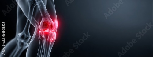 Human knee joint with pain and inflammation highlighted in red on a dark background