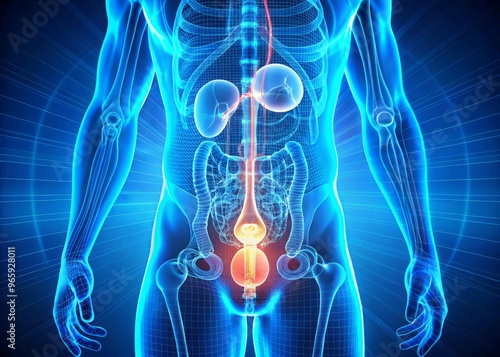 Human male reproduction system diagram clear illustration simple design futuristic style anatomy labeled scientific drawing colorful bright blue tone exploring inner workings of body parts