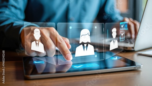 Human resource management technology (HR), Human resource manager touching human resource network structure and checks the CV online to choose the perfect employee for company, Effective recruitment.