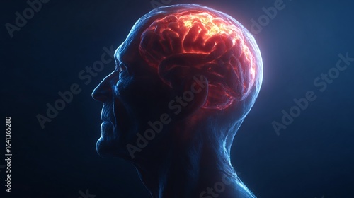 Human silhouette with glowing brain, focus on intellectual creativity, vibrant colors emphasize innovation and ideas.
