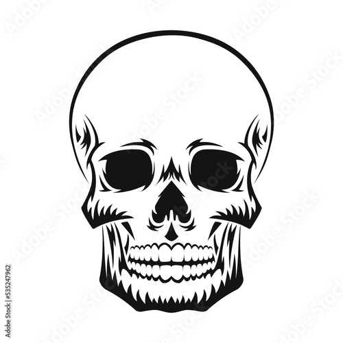 Human skull. Black silhouette. Design element. Hand drawn sketch. Vintage style. Vector illustration isolated on white background.