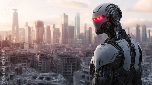 humanoid robot with glowing red eyes surveys the ruins of a destroyed urban landscape