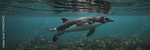 Humboldt penguin swimming underwater, surrounded by kelp , spheniscus humboldti, marine life, sea life