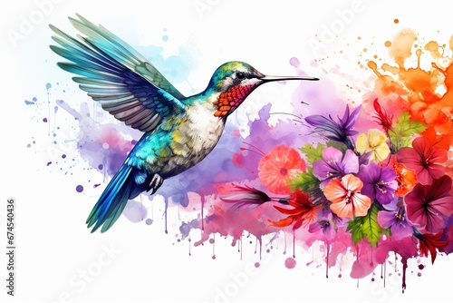 Hummingbird in Flight: Watercolor Style Illustration with Colorful Flowers