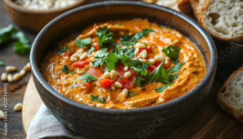 Hummus in a bowl with vegetables (red pepper) pine nuts and bread, close-up, horizontal