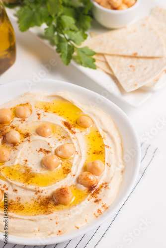 Hummus in a plate with chickpeas, smoked paprika, olive oil and pita. Vegetarian food.