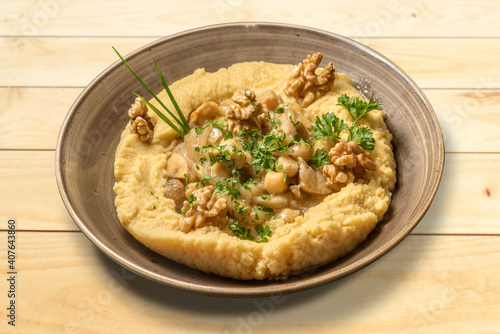 Hummus with parsley, olive oil and walnuts. Israeli chickpea cream in earthenware bowl on wooden table