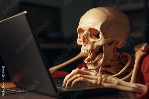 Humorous image of a skeleton using a laptop, symbolizing long hours and exhaustion in digital work culture. Perfect for creative projects.