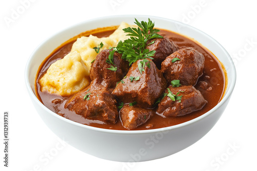 Hungarian beef goulash with dumplings isolated on transparent white background
