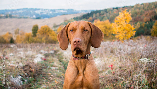 Hungarian hound pointer vizsla dog in autumn time in the field