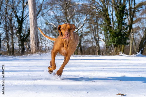 nature, hungarian, vizsla, snow, animal, puppy, dog, brown, running, jumping, sparkling, wildlife, cold, winter, pet, canino, white, fun, breed, play, retriever, outdoors, mammal, playing, dog, cute, gold
