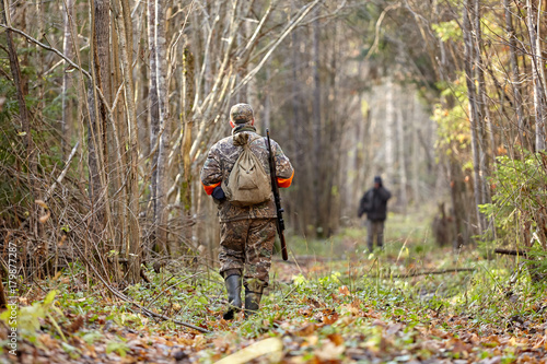 Hunter in camouflage clothes with hunting rifle during a winter hunting