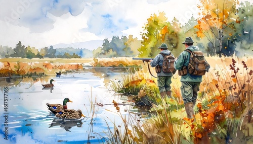hunter, duck, autumn, nature, landscape, water, forest, hunting, wildlife, shooting, outdoors, scenery, bird, reservoir, lake, river, autumn, wood, creek, photo, illustration, watercolor, art, painting, game