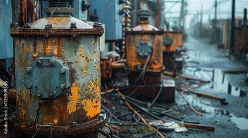 transformer, hurricane, damaged, electrical, storm, rain, weathering, rust, debris, puddle, aftermath, industrial, urban, isolation, erosion, technology, power, environment, destruction, gloom, decay, infrastructure, haze, moody, wire, shadow, mist, reflections, melancholy, abandoned