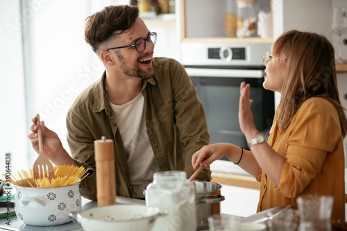 Husband and wife in kitchen. Young couple preparing delicious food at home.