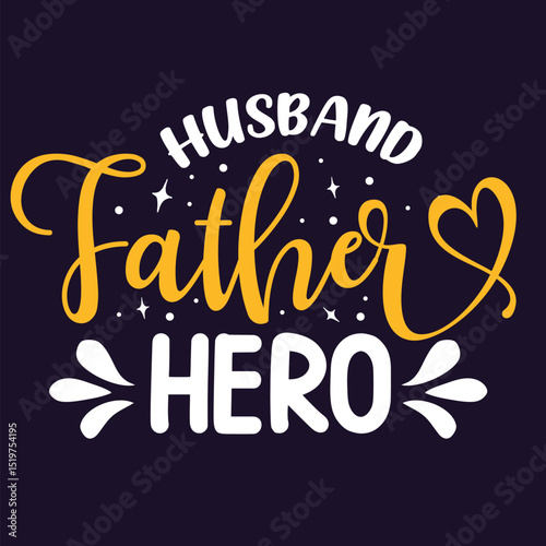 husband, father, hero, love, design, quote, lettering, typography, text, vector, illustration, graphic, art, greeting, card, holiday, celebration, father, eltern, family, fathers day, gift, modern, decorative, stylish, star, nubes, badge, label, banner, poster, template, t-shirt, printable, sticker, dark background, white, yellow, handwritten, hand-made, elegant, simple, creative, awesome