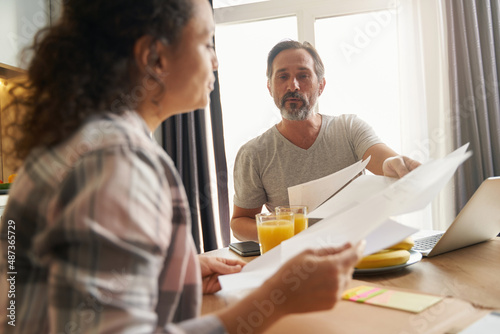 man, male, laptop, woman, work, female, table, wife, juice, kitchen, husband, document, paper, glasses, home, family, study, check, room, look, inside, computer, caucasian, sheet, pass, house, give, indoor, lifestyle, hispanic, paperwork, couple, documentation