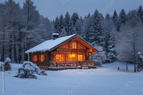 Hutte rustique en bois entourée de pins enneigés, avec une lueur chaleureuse émanant des fenêtres