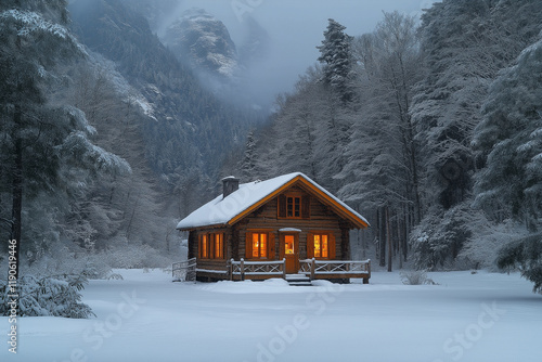 Hutte rustique en bois entourée de pins enneigés, avec une lueur chaleureuse émanant des fenêtres