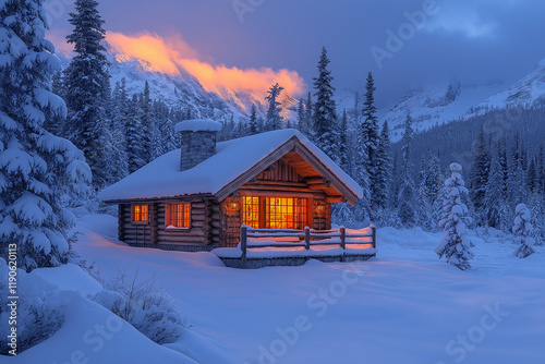 Hutte rustique en bois entourée de pins enneigés, avec une lueur chaleureuse émanant des fenêtres
