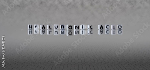 hyaluronic acid word or concept represented by black and white letter cubes on a grey horizon background stretching to infinity