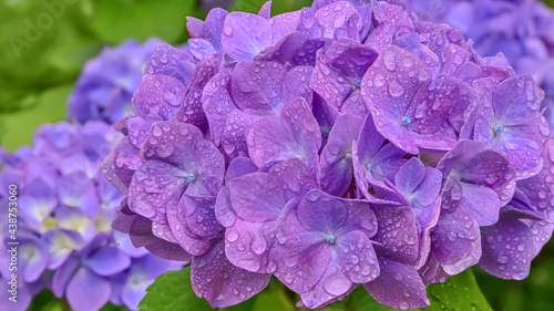 flower, hydrangea, june, plant, rainy season, flower petals, june, sweet, love, lovely, open air, up, leaf, clean, pretty, full bloom, pink, background, pink, closeup, light, copy space, macro, rain, waterdrop, dew, drop, water, sky blue, blue, season, nature, purple, plant, spring, garden