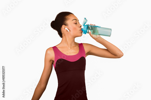 aerobic, hydratation, athletic, female, muscular, loss, physical exercise, earphones, fit, sport, adult, white, motivation, banner, drink, lady, fitness, activewear, people, body, gym, african american, exercise, earbud, background, isolated, water, studio, afro, lifestyle, black, healthy, woman, slender, electronic, person, girl, training, care, concept, slim, dehydrated, thirst, bottle, young, standing, weight, wellness