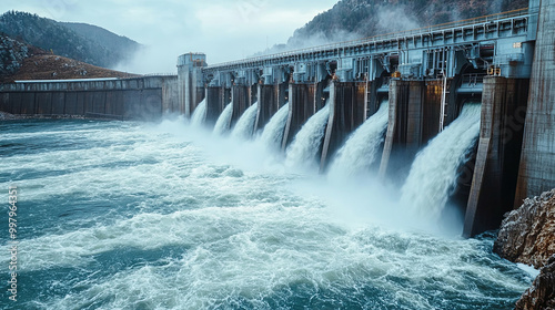 hydroelectric dam showcases powerful water flow, generating energy while creating stunning natural scene. massive structure stands against backdrop of mountains, emphasizing its significance
