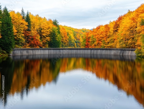 Hydropower dam surrounded by vibrant autumn trees reflecting in the water, hydropower, seasonal renewable energy