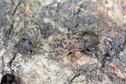 Hylesinus varius formerly fraxini is a species of weevil native to Europe - ash bark beetle. Camouflaging body coloration on tree bark.