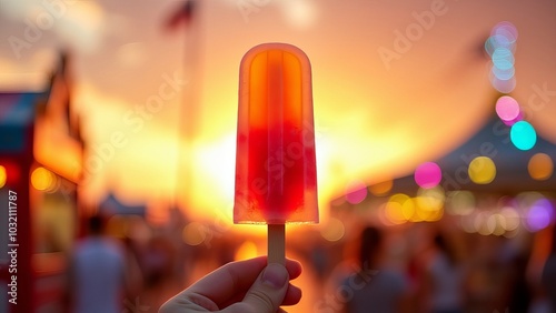 Hyper realistic frozen popsicle, vibrant red with sunset background, bokeh lights, summer fair, macro photography,