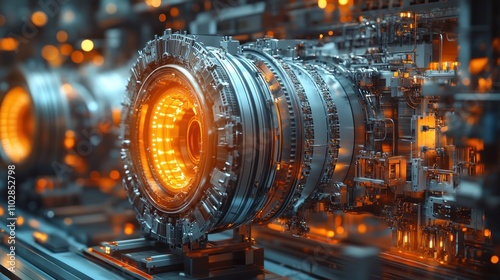 Hyper-detailed machinery assembling energy-efficient electric generators for wind farms.