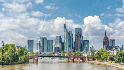 Hyperlapse of Frankfurt's skyscrapers skyline with the bell tower overlooking Alte Brucke. Frankfurt, Germany