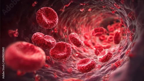 Hyperlipidemia 3D render blocked artery concept. Close-up view of red blood cells flowing through a blood vessel.