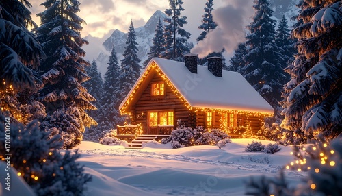 Hyper-realistic 3D scene of a snow-covered cabin with warm golden lights inside, surrounded by pine trees and glowing Christmas decorations