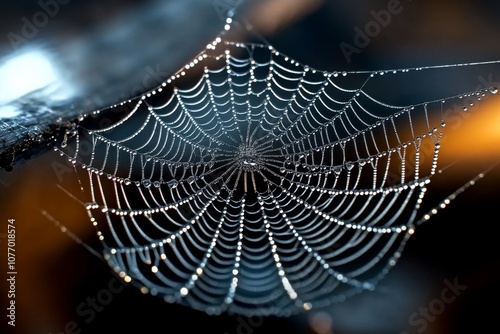 Hyper-realistic close-up of a dew-covered spiderweb in the morning, with fine details of each strand and droplet