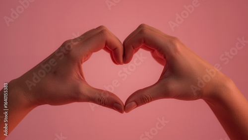 Hyperrealistic Closeup of Two Hands Forming a Heart Shape, Symbolizing Love, Unity, and Care on a Pink Background