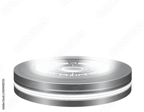 Hyper-realistic gray metallic round podium with holographic light beams and glowing d 38643