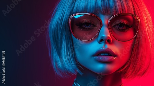 hyperrealistic popstar with futuristic visor sunglasses, platinum blonde bob wig and cat suit. Turquoise glowing lighting