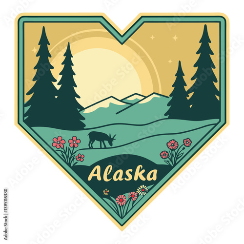 alaska, heart-shaped, illustration, sun, moon, mountain, evergreen tree, cervid, flower, nature, scenic, travel, tour tourism, whimsical, artistic, landscape, wildlife, adventure, serene, colourful, wilderness
