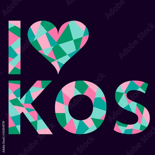I Love Kos. Mosaic isolated inscription. Letters from pieces of triangles and polygons. Pink, mint, green. Kos - island in Greece. For prints on clothing, t-shirts, banner, poster, souvenir, cards.