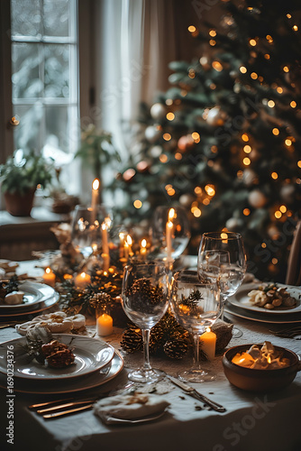 table, glasses, eatery, christmas, dinner, wine, setting, dining, drink, food, decoration, wedding, celebration, plate, party, holiday, champaign, banquet, napkin, candle, alcohol, luxury, fork, set, meal
