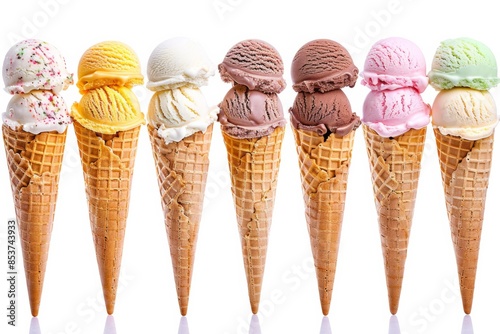 ice cream, cone, dessert, scoop, scoop, favor, sweet, treat, summer, cold, glacé, creamy, dairy, vanilla, chocolate, strawberry, mint, green, food, refreshment, snack, celebration, indulgence, colourful, delight, refreshing, isolated, background, group, assorted, delicious, tasty, variety, set, collection, display, row, lined up, multiple, 7, hi-res, vibrant, photogenic, mouth-watering