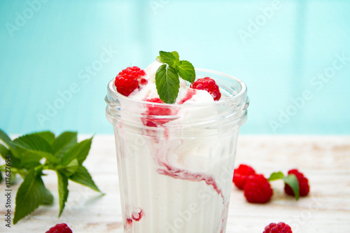 ice cream, dessert, view, main, wood background, raspberry, berry, sirup, sweet, cool, fresh, relax, relaxation, swimming pool, water, summer, sun, vanilla, food, tasty, glasses, rustic, mint, green, blue, white
